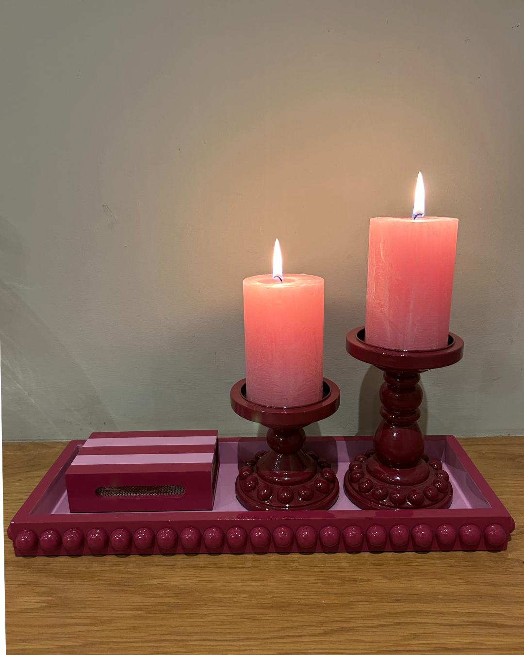 Add a touch of charm and colour to your home with our bobbin-style red and pink decorative tray. Handcrafted with a lacquer finish and a beautifully detailed bobbin edge, this tray is perfect for serving drinks, displaying candles, or styling a coffee table. The bold red and pink palette brings warmth and personality to any space, blending playful design with timeless craftsmanship.