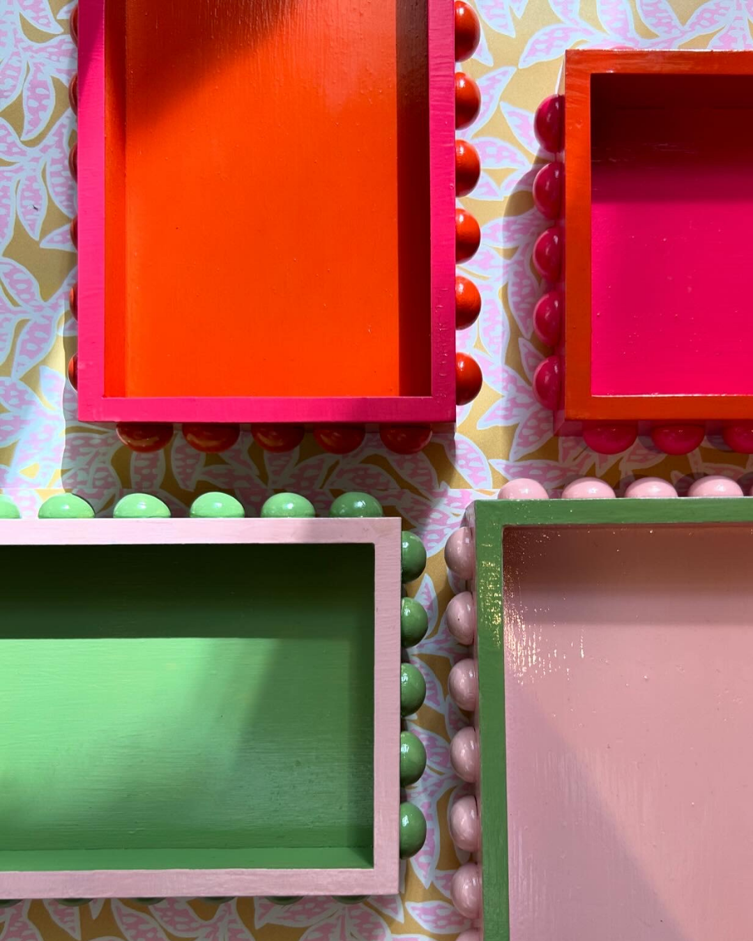 Add a touch of charm and colour to your home with our bobbin-style Orange decorative tray. Handcrafted with a lacquer finish and a beautifully detailed bobbin edge, this tray is perfect for serving drinks, displaying candles, or styling a coffee table. The bold red and pink palette brings warmth and personality to any space, blending playful design with timeless craftsmanship.